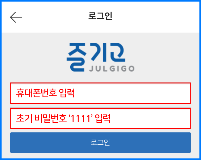 1. 가입한 휴대전화 번호와 문자로 발송된 초기 비밀번호 '1111'입력후 로그인